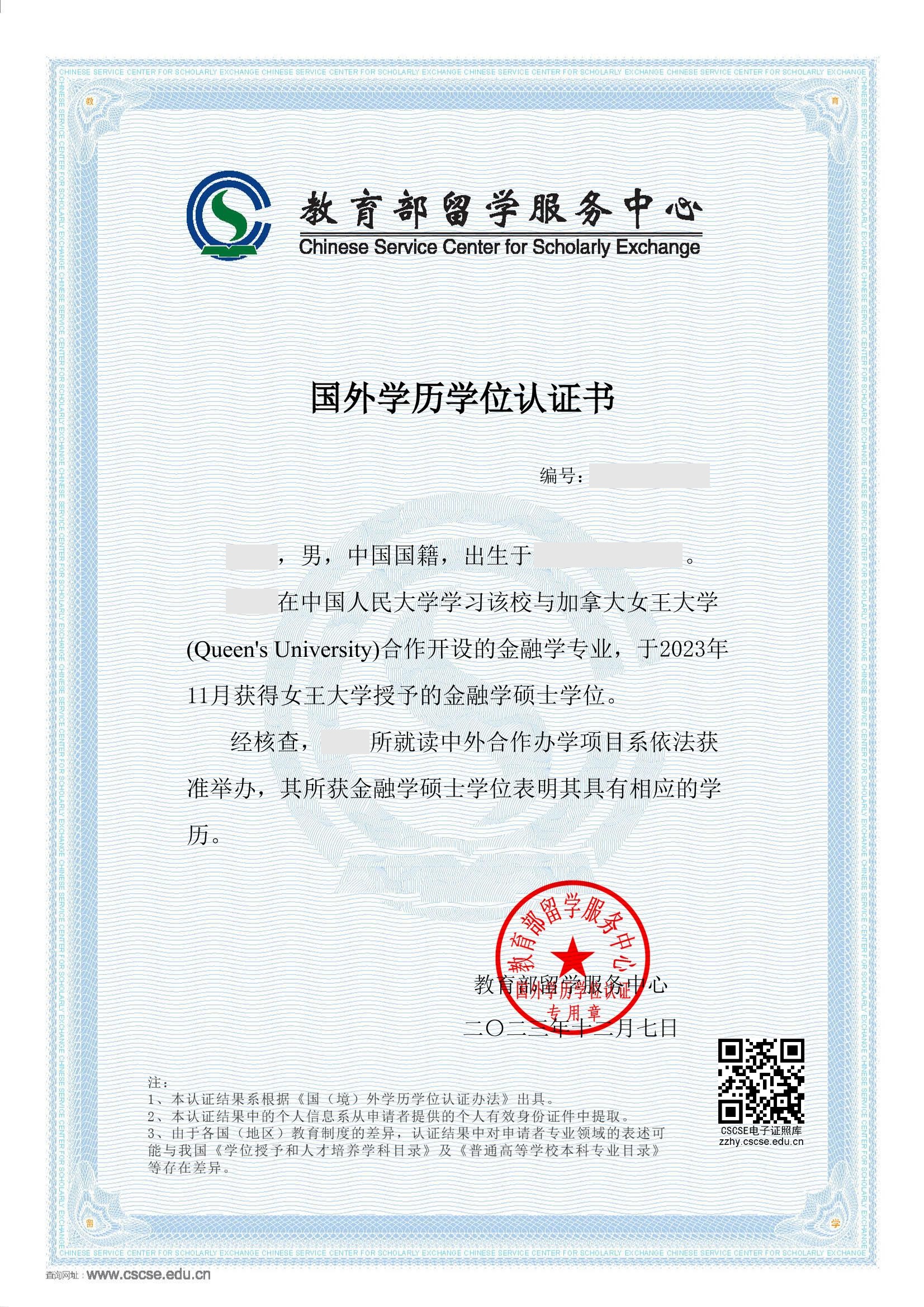 图为:2023年加拿大女王大学金融硕士学位证书;2023年中国教育部留学服务中心认证证书