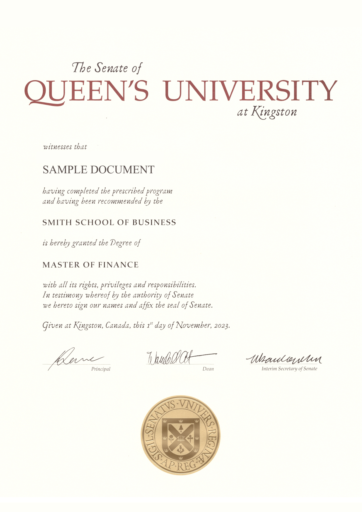 完成本项目十门课程,通过考核符合毕业要求的学生将获得由女王大学颁发的金融硕士学位证书,该学位受教育部认可(批准书编号:MOE11CA1A20131441N)。